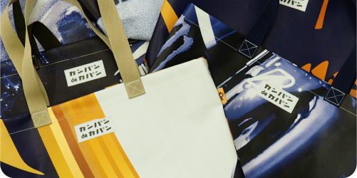 使用済みの横断幕や懸垂幕、看板作成時にできたカッティングシートの切れ端を利用して商品開発を行っています。